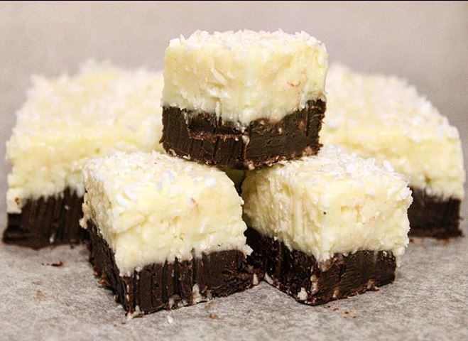 - Voeg de resterende kokosolie, gecondenseerde melk, Malibu rum en 100 gram geraspte kokos toe. Roer tot het een dik, glad en egaal mengsel is geworden. Haal de fudge uit de vriezer en verdeel de witte chocolade gelijkmatig over de pure chocolade. Top af met geraspte kokosnoot. Laat het minimaal een uur in de vriezer staan.