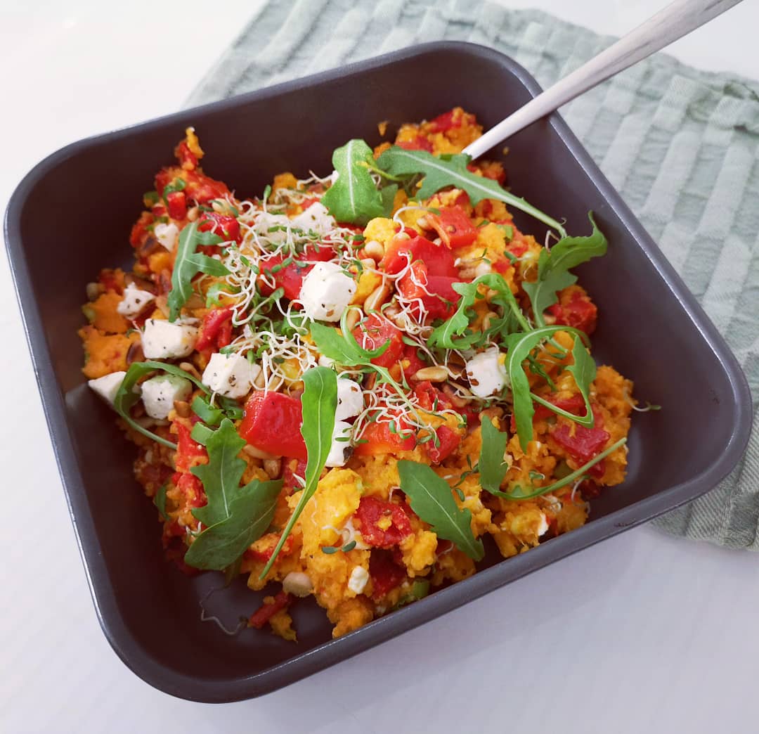 Zoete aardappelstamppot met geroosterde paprika, rucola en witte kaas.
